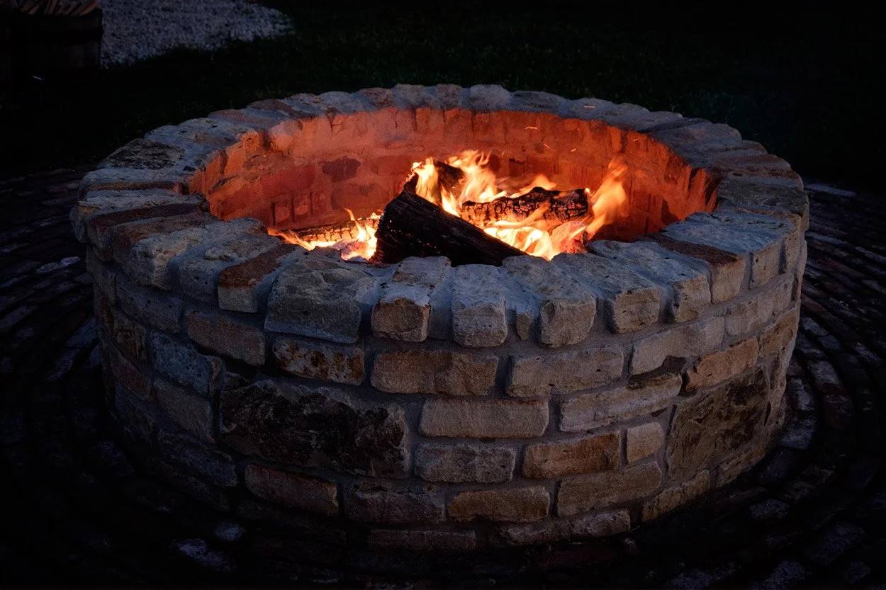 Located near the gazebo is a large, round custom-built stone firepit set atop brick pavers. Ideal for s’mores, photo opportunities, and fire-side chats, the warmth adds an inviting element that is popular among many guests.