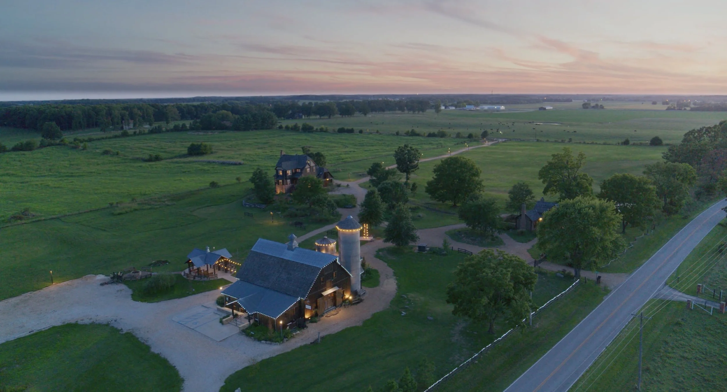 The natural river rock drive connects to both the venue and cottage. A private drive, named Longline road, winds through the acreage at a separate entrance. A paver patio is nestled next to the estate surrounded by landscaping for a perfect outdoor gathering place. With a private bathroom for each bedroom, two large living spaces, two full kitchens, and ample space for parking, the estate can serve as a beautiful home with the potential to be converted into a one-of-a-kind bed and breakfast.