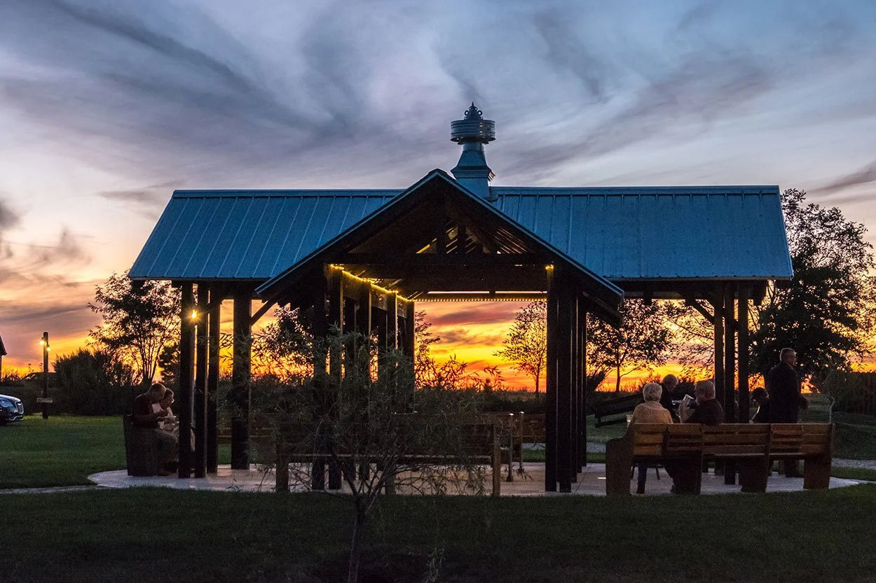 The Pavilion where “Vows are woven into storied time” is a stunning structure. The open gable wood style features exposed beams and a high-arched roof that show off the hand-built strength. With bench seating overlooking rolling hills, the pavilion has hosted many ceremonies.
